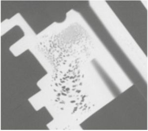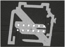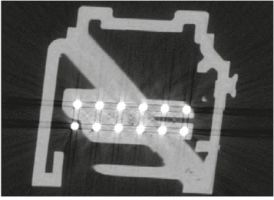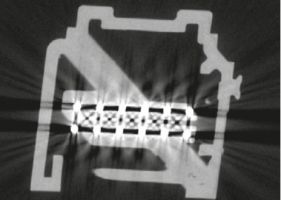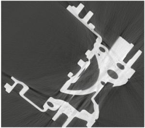 • Hintergrund: Wenn ein Bauteil aus Materialien mit stark unterschiedlichen Dichten besteht (z. B. Kunststoff und Metall), können Streifen- und Schattenartefakte auftreten. Diese entstehen durch ungleichmäßige Absorption der Röntgenstrahlung und beeinträchtigen die Bildqualität.